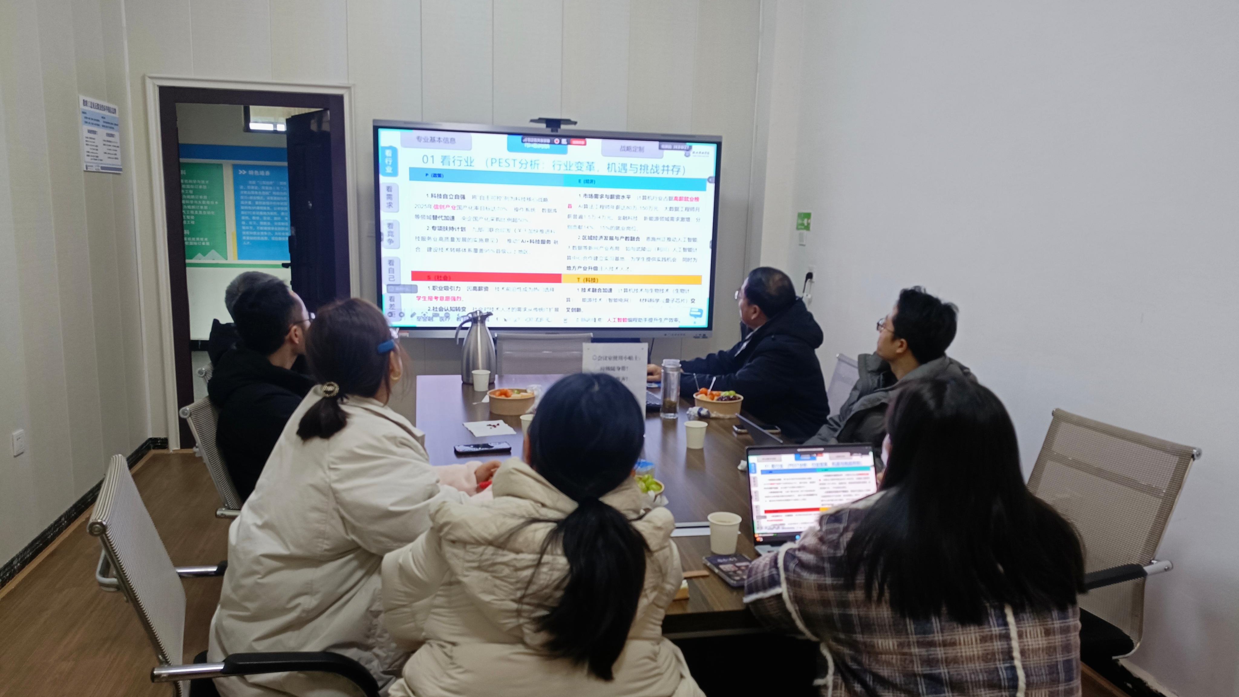 会议通过SWOT分析系统梳理专业发展脉络:校企合作资源丰富、竞赛与实习基地多元、信创(鸿蒙课程)布局领先为核心优势;地处偏远导致本地产业支撑有限、实验实训条件不足为主要短板;人工智能、信创产业兴起带来新赛道机遇,同时人工智能技术替代风险构成潜在威胁。